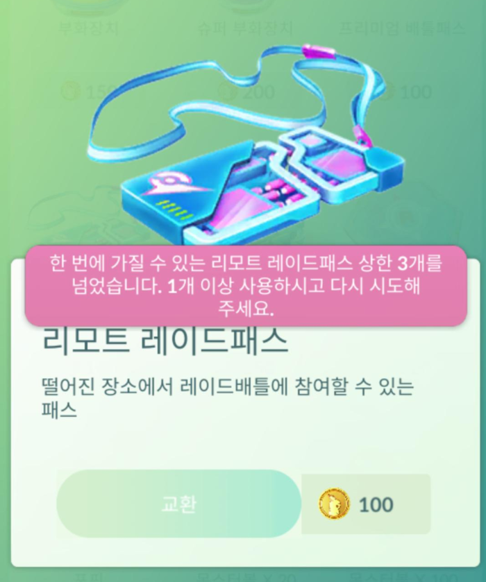 - 가질 수 있는 리모트 레이드 패스의 수는 3장이며 3장 이상 구매를 시도하면 구매가 불가능하다고 표시됩니다.